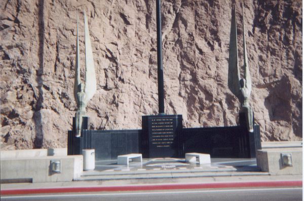 Now we come to the fourth thing that bowled me over: The Hoover (or Boulder) Dam. The place is a modern-day pyramid, an absolute wonder. This is a monument commemorating the heavens as they were and as they were known when the dam was dedicated. I love Art Deco architecture and monuments: their soaring lines and graceful curves make it my favorite architectural style. Pity it had the misfortune to be associated with the authoritarian and totalitarian movements of the day, as it truly is a classic form. I took this picture very early in the day, before the traffic started to fill up the bridge.